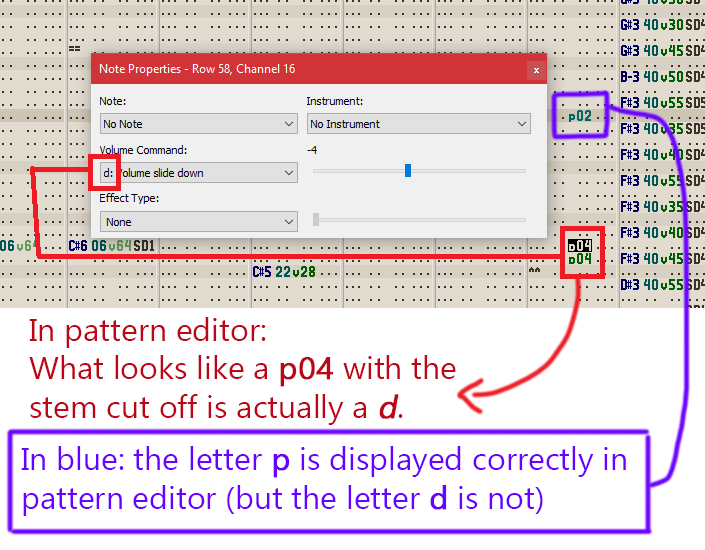 | Description | In Pattern Editor, what looks like a p with the stem cut off is actually the letter "d". Can this be fixed? I attached a screenshot so you can see what I'm referring to. It's a minor bug, but always causes me to mess up panning (p) instead of changing volume (d). | ||||