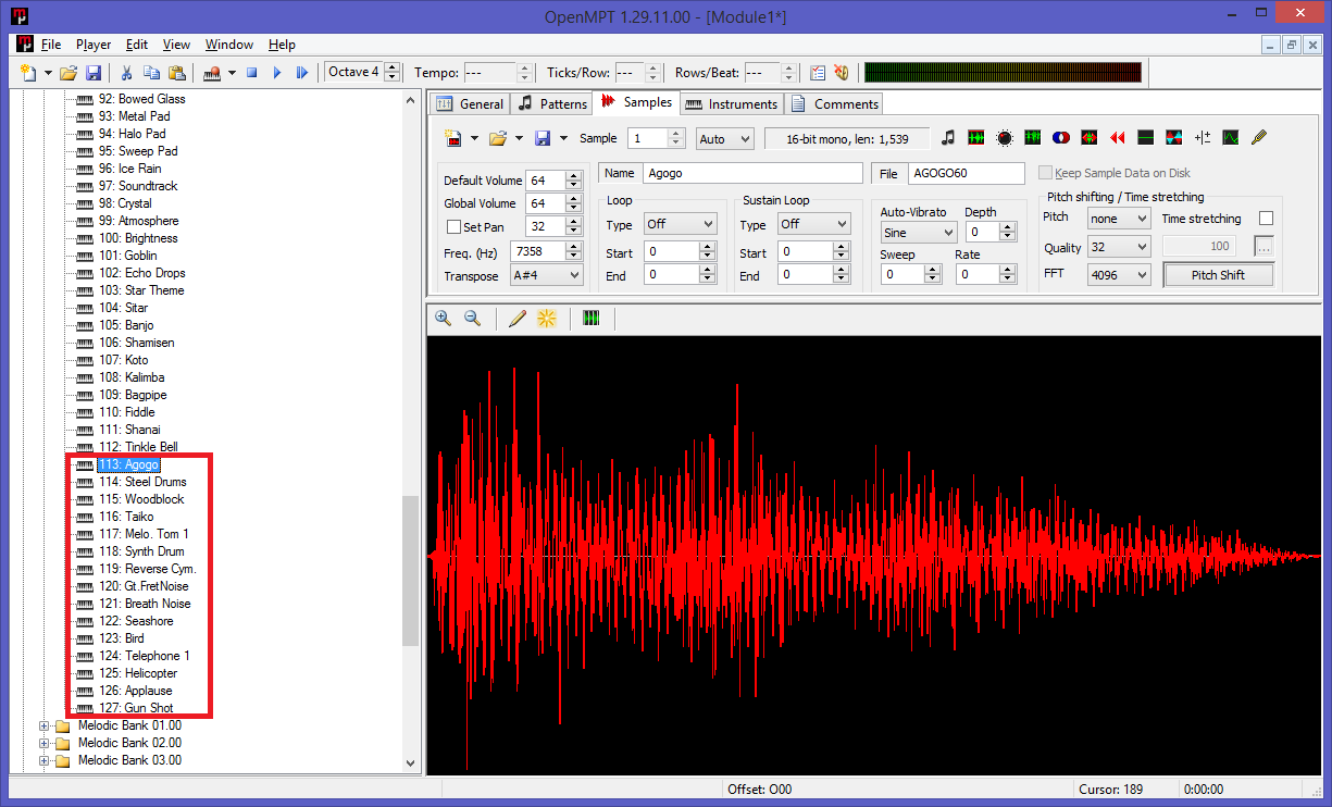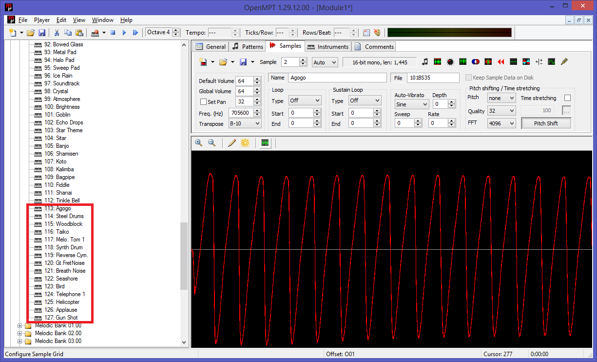 | Steps To Reproduce | 1) Use 1.29.12.00 2) Create empty module or load one 3) "Import" one of the shown instruments from GM.DLS (see one of the pictures which one are affected) 4) Look in the Sample tab and/or play back the selected instrument/sample | ||||
