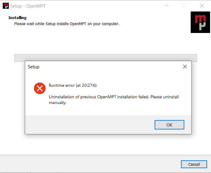 | Description | When trying to install the new version of OpenMPT 1.30.01.00, a message later pops up saying "There was a problem removing the previous OpenMPT installation." When I click OK, another message pops up saying, "Runtime error (at 20:274): Uninstallation of previous OpenMPT installation failed. Please uninstall manually." I find this peculiar, since upon inspecting, I found that the previous version was already uninstalled both 32bit and 64bit | ||||