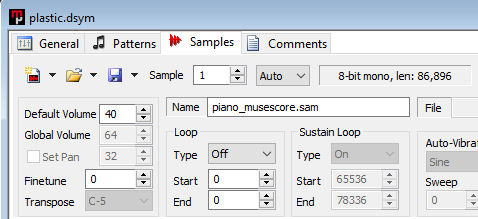 | Description | Digital Symphony sample loops are loaded as sustain loops, but the sustain loop fields are not directly editable. The sustain loop arrows in the sample display are editable, and converting to IT allows editing the fields, so this is mainly a cosmetic annoyance. | ||||