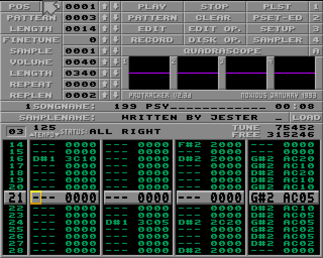 Here I opened the module in Protracker 2.3D. Attached is a screenshot. It looks like the Z doesn't show on my setup. I will note that I'm not familiar with what options the Amiga had for international users and if Jester being from Germany would have installed some language pack or something similar in concept and if that would have an impact on Protracker. |