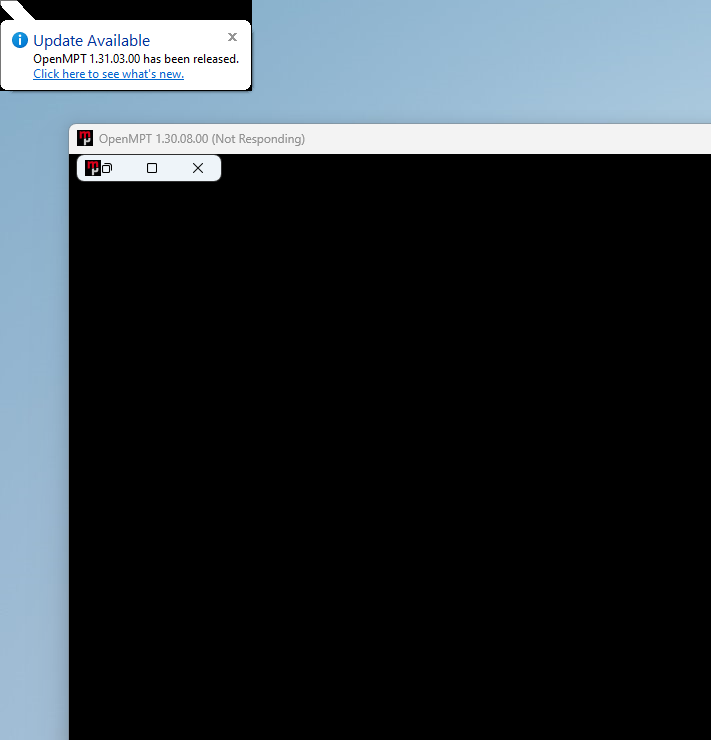 As soon as there is an update to OpenMPT, the "text balloon" stating this will be on top of the left most screen and the client is unresponsive.