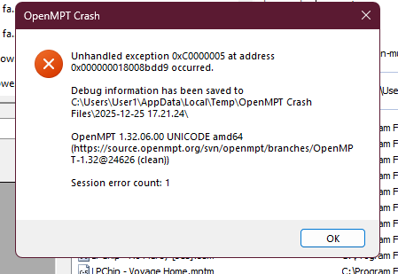 | 2025-12-26 19:00 | Saga Musix | Summary | WHAT THE FUCK? MY OPENMPT KEEPS CRASHING! => OpenMPT crash (caused by Rivatuner) |
