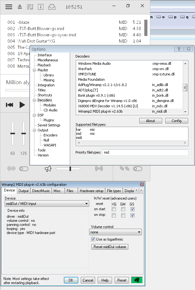 | Description | This my answer to you answer on this topic https://bugs.openmpt.org/view.php?id=1954 because you close topic and I was can not answer to you Yes , but I want one universal player for music , trackers and MIDI , if you not hard , please make plugin for XMPlay , this player I now use for Wave , MP3 , AAC , OPUS , FLAC , TAK , AC3 , M4A , APE , DFF , DSF , WMA , OGA , OGG , OFS , OFR , MKA , WV , but I can not use this player for normal play MIDI , MID , KAR , RMI , CMF files , simply absent normal plugin for transmit this formats to synhesizers | ||||