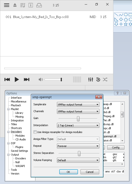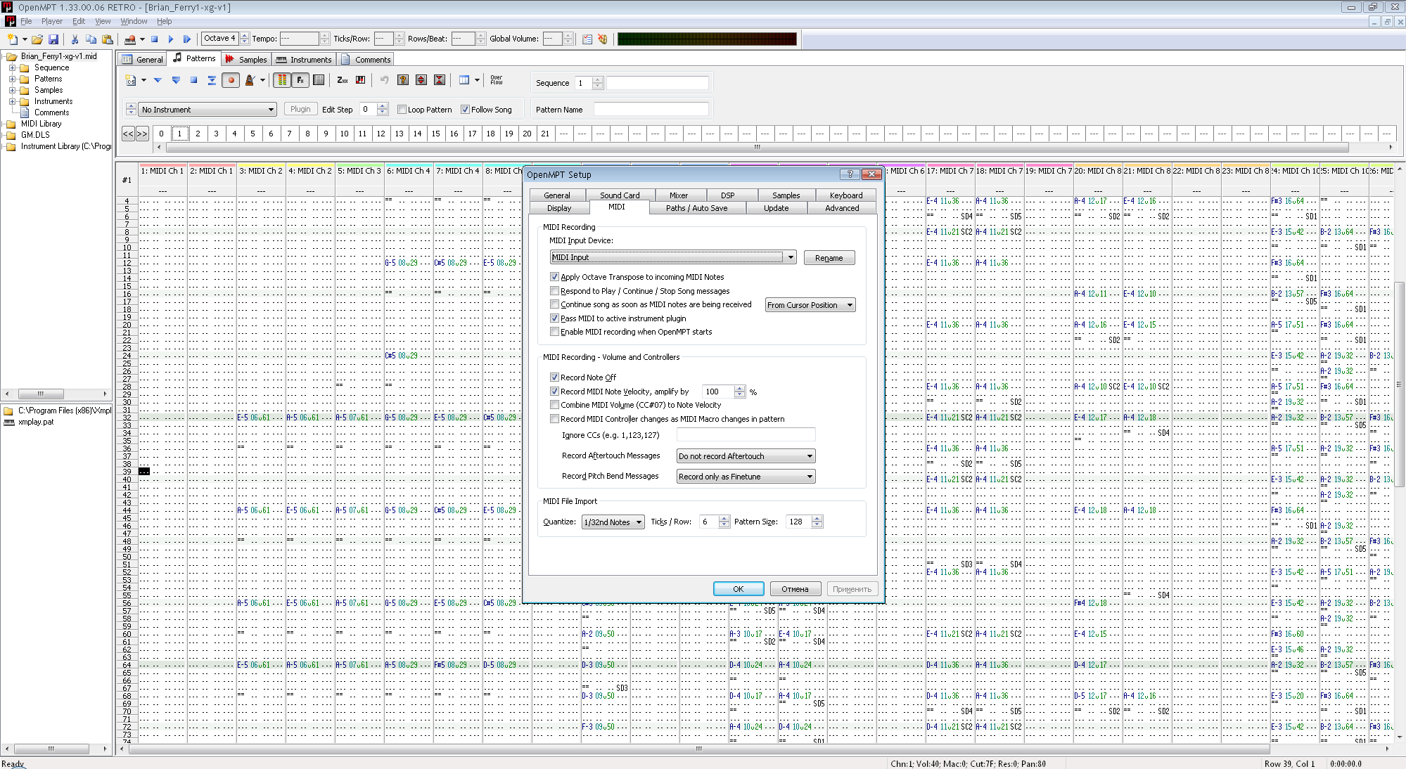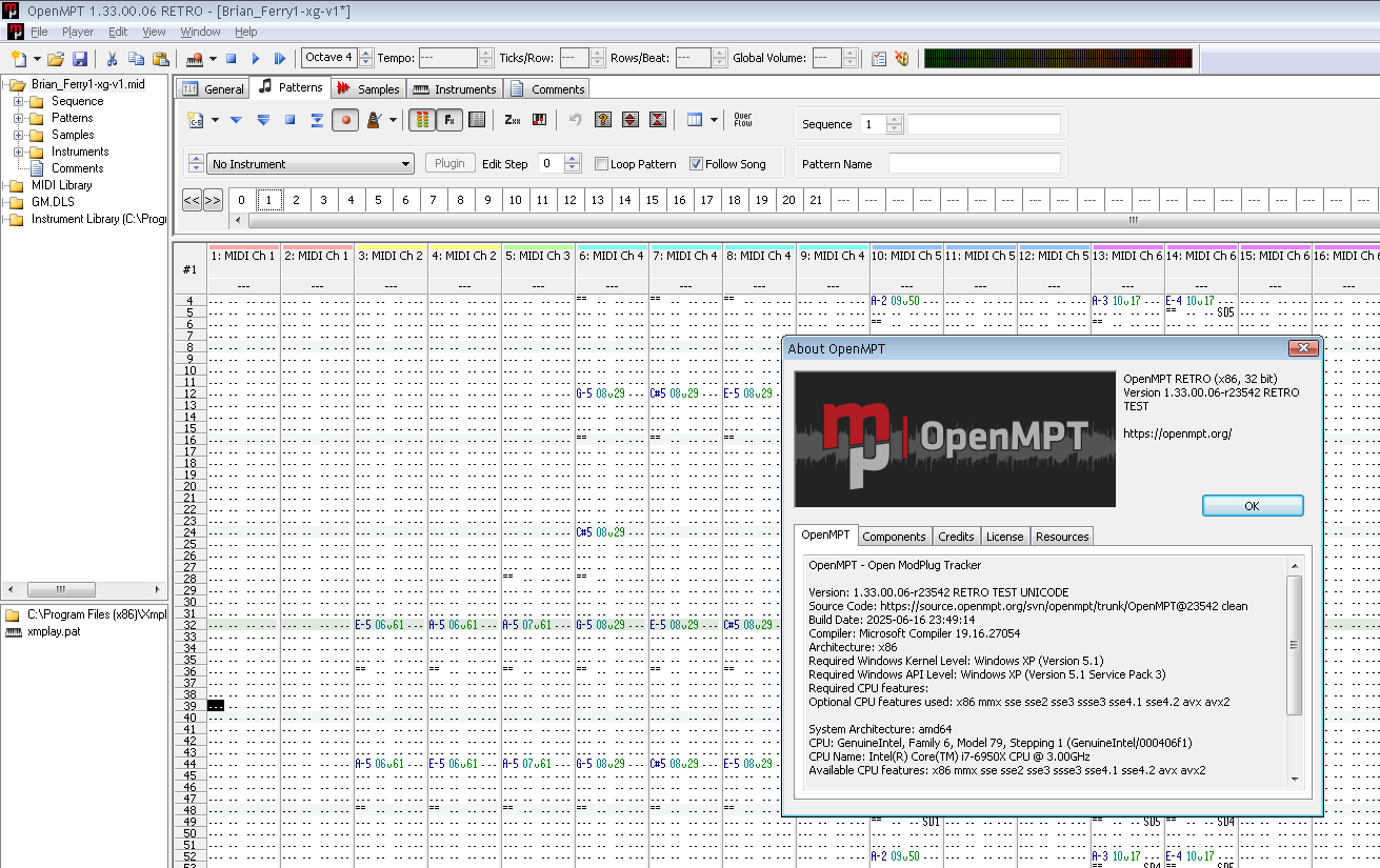 | Description | I'm heared you , and yet , but I do tested this in OpenMPT RETRO (x86) 32 bit Version 1.33.00.06-r23542 RETRO TEST , and if I open MIDI file in this tracker and play opened file , I recive music on Microsoft GS Wavetable Synth or generated sounds of GM.dls thus I understand that core OpenMPT can read and play MIDI files , but this core can not select output MIDI device , that's why I again ofer you add this option in LibOpenMPT as option MIDI output , as this make with samplerate , channels , interpolation , repeat , volume , the only thing this must be different , this two feature : Please , not angry to me , I want help improve functions and in LibOpenMPT plugin , and solve with XMPlay via improved LibOpenMPT plugin Unfortunately, I cannot go here https://forum.openmpt.org/ that’s why I'm writing through the bug tracker Somehow I was able , please excusme , now duplicate topic on forum https://forum.openmpt.org/index.php?topic=7457.0 | ||||