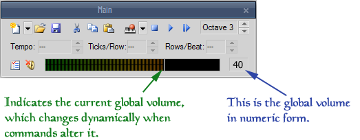 Implemented in r22127. I went with a slightly different approach: The global volume is now shown like the other numeric properties. As it adds quite a bit to the width of the toolbar, the rows per beat are no longer shown by default so that the toolbar works at 1024 pixel width. However, all of those custom controls in the toolbar can now be toggled via the context menu, so people with a large enough screen can bring the rows per beat display back as well. Once I am able to fix the dynamic layouting of the toolbar, I might bring the control back by default. |