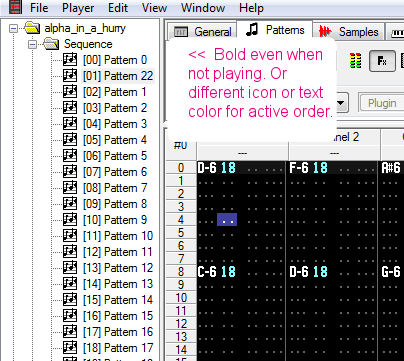 | Description | I suggest changing text color, icon color or text boldness on the currently active order in the left sequence tree. The current behavior is only changing it to bold during playback. This would allow better use of the left sequence/order list when navigating the song. It's a minor tweak, but important if you want to use the sequence tree instead of the horizontal order list. | ||||