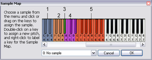 | Description | As many improvements that have been made on the Sample Map dialog, it's still laborious and clunky when trying to assign multiple samples in one instrument setting. Instead of red dots and choosing which sample to show, perhaps an intuitive, color-coded, and labeled keyboard would help visualize how the samples are set up. (See the attached graphic for my vision.) | ||||