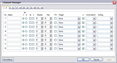 The next 3 columns are on my wish list of the Instrument Lock request i made in another post. These would take a little longer to implement since new methods would have to be created. But here it is: The Reconfigure button uses the same functions and layout as the Reorder/Remove tab of the present Channel Manager. I like how that's implemented and it's so easy to work with. Each page can hold 8 channels, and the "folder tabs" increase as channels are added, just like the Channel Mixer in the General page. The tabbing order (when you press tab for input focus of the controls) is across, but if you press Return with any control, it moves to the next control DOWN. (This will it easier to batch-name or batch-set.) There are also multiple mouseclick variations when clicking on a button control: The Volume and Pan controls could be sliders, but i figure it would take too much space, maybe unnecessarily. The increment/decrement button for these use the same Ctrl-click and Shift-Ctrl-click methods as above, but additionally, if you SHIFT-click an arrow button it will increment/decrement RELATIVE to each channel's given value. IOW, Ctrl-clicking will increment/decrement that channel's Volume/pan and set all to the same value as this channel, while Shift-clicking will add/subtract 1 towards whatever value each channel has. | ||||