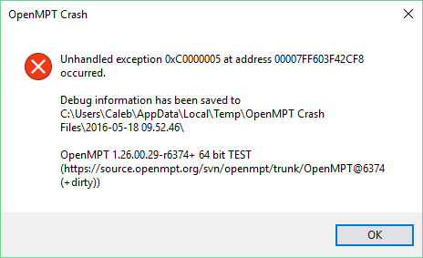 I cannot debug a crash dump generated from self-compiled executables, so please always use the test builds from buildbot.openmpt.org when reporting issues. |