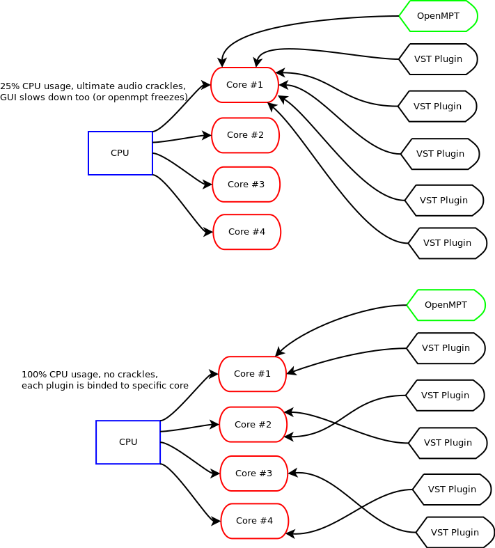 | Description | We know that a lot of VST plugins are very CPU hungry. It became a problem on modern machines with multiple cores. For example: I can normally play my song with 4-6 VSTs on 13-year-old CPU (only 1 core) and it will work fine without issues but OpenMPT stucks on my modern laptop (with 4 cores!!!). I described this problem here: https://appdb.winehq.org/objectManager.php?sClass=version&iId=34633) Despite the fact that the tests show: 1 intel core is almost equal to 1 amd core, these cores on my laptop are very slow by some reason in OpenMPT (probably bad hardware) and I can use only 25% (!) of my processor. Imagine, if I had 8 core processor but the cores are slow. Allow users to use multiple cores and bind each VST plugin to specific core. (see attachment) | ||||
